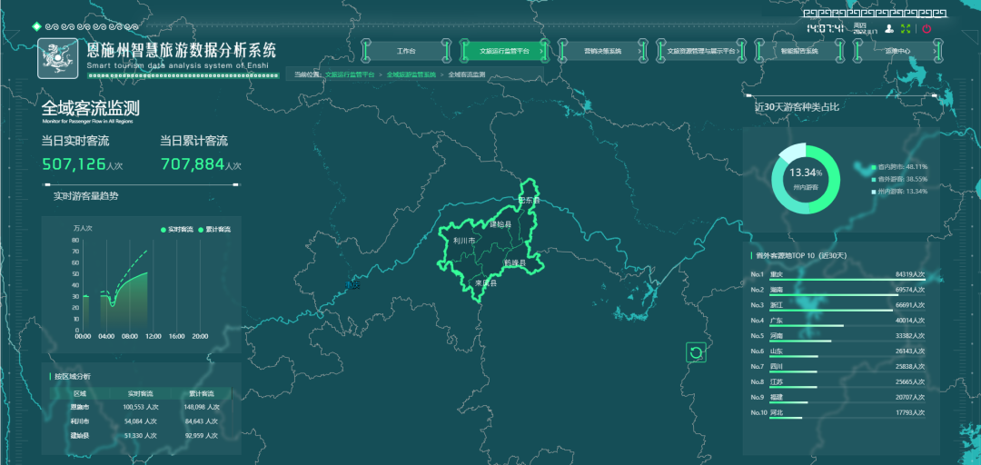 恩施州智慧旅游數(shù)據(jù)分析系統(tǒng)于2022年3月啟動建設(shè),2022年9月上線試運行,完成了文旅資源管理與展示平臺、旅運行監(jiān)管平臺、營銷決策系統(tǒng)、智能報告系統(tǒng)等4大板塊12子系統(tǒng)合計36個功能模塊的開發(fā)。系統(tǒng)共收集了恩施州6縣2市的景區(qū)、旅行社、酒店、博物館、圖書館、文化館、村村響、發(fā)射站等3000余條基礎(chǔ)數(shù)據(jù),完成13家A級景區(qū)客流、25家景區(qū)175路視頻(恩施州景區(qū)視頻指揮調(diào)度系統(tǒng))對接,也完成了OTA網(wǎng)評、交通擁堵、全域客流等第三方數(shù)據(jù)對接。