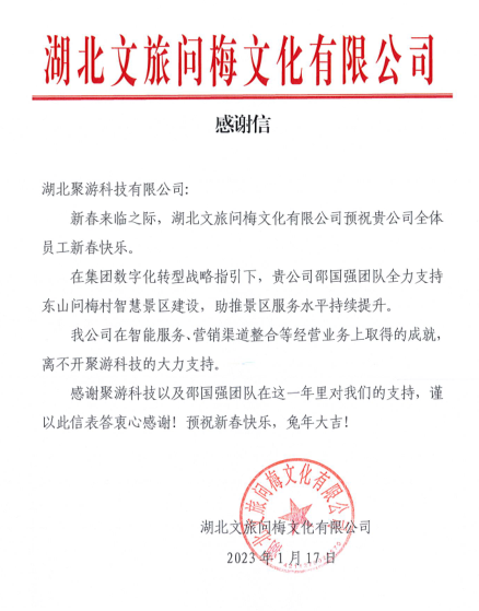 新春到來之際,聚游科技收到來自湖北文旅問梅文化有限公司(黃梅公司)的感謝信。信中寫道:在集團(tuán)數(shù)字化轉(zhuǎn)型戰(zhàn)略指引下,聚游科技智慧景區(qū)建設(shè)團(tuán)隊(duì)全力支持東山問梅村智慧景區(qū)建設(shè),有力地助推了景區(qū)服務(wù)質(zhì)量提升,助力公司在智能服務(wù)、營銷渠道整合等等經(jīng)營業(yè)務(wù)上取得成就。