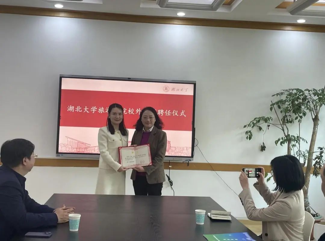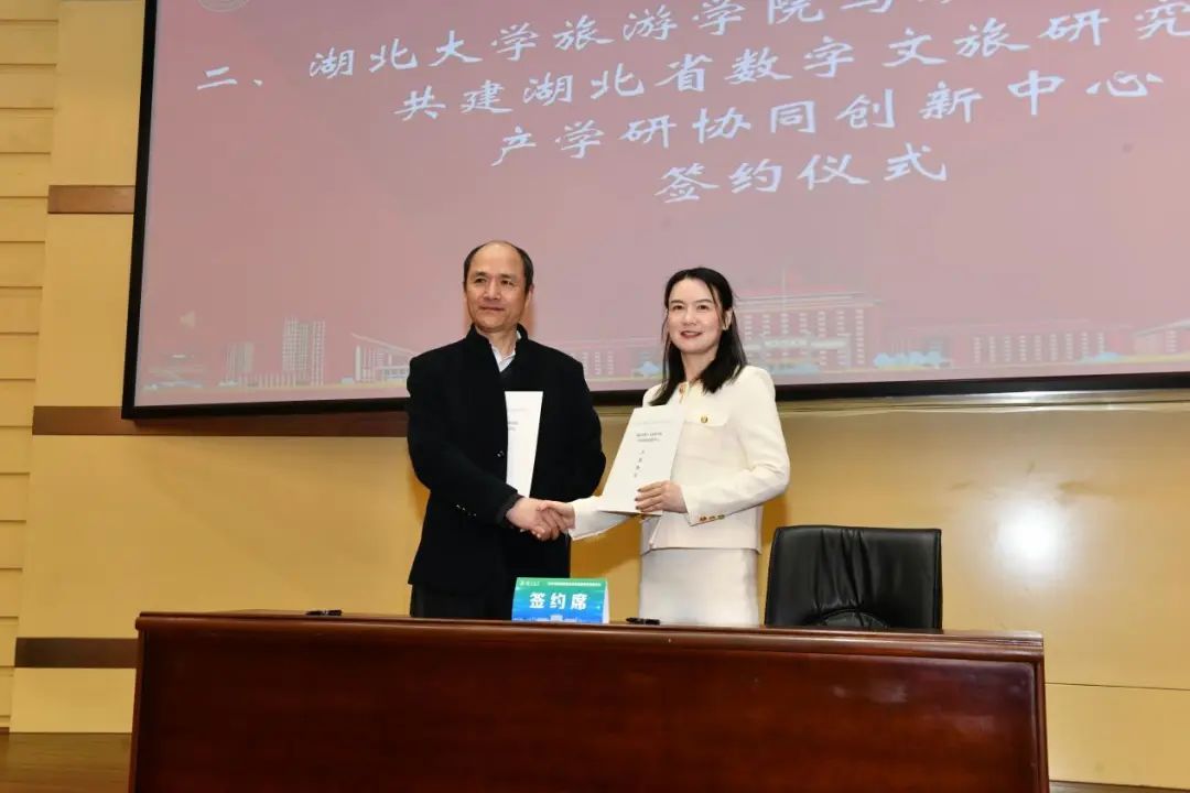 會上,湖北數(shù)字文旅集團(tuán)總經(jīng)理羅圓與湖北大學(xué)旅游學(xué)院黨委書記宋鴻簽訂產(chǎn)學(xué)研協(xié)同創(chuàng)新中心共建協(xié)議,雙方將圍繞數(shù)字文旅頂層設(shè)計、科技創(chuàng)新項目申報、科技成果創(chuàng)新轉(zhuǎn)化、文旅體驗產(chǎn)品打造、人才培養(yǎng)、培訓(xùn)基地打造等方面開展合作。為構(gòu)建院企協(xié)同育人機(jī)制,推動產(chǎn)學(xué)研一體化,發(fā)揮企業(yè)導(dǎo)師作用,羅圓還被聘任為湖北大學(xué)旅游管理專業(yè)學(xué)位碩士研究生校外導(dǎo)師。