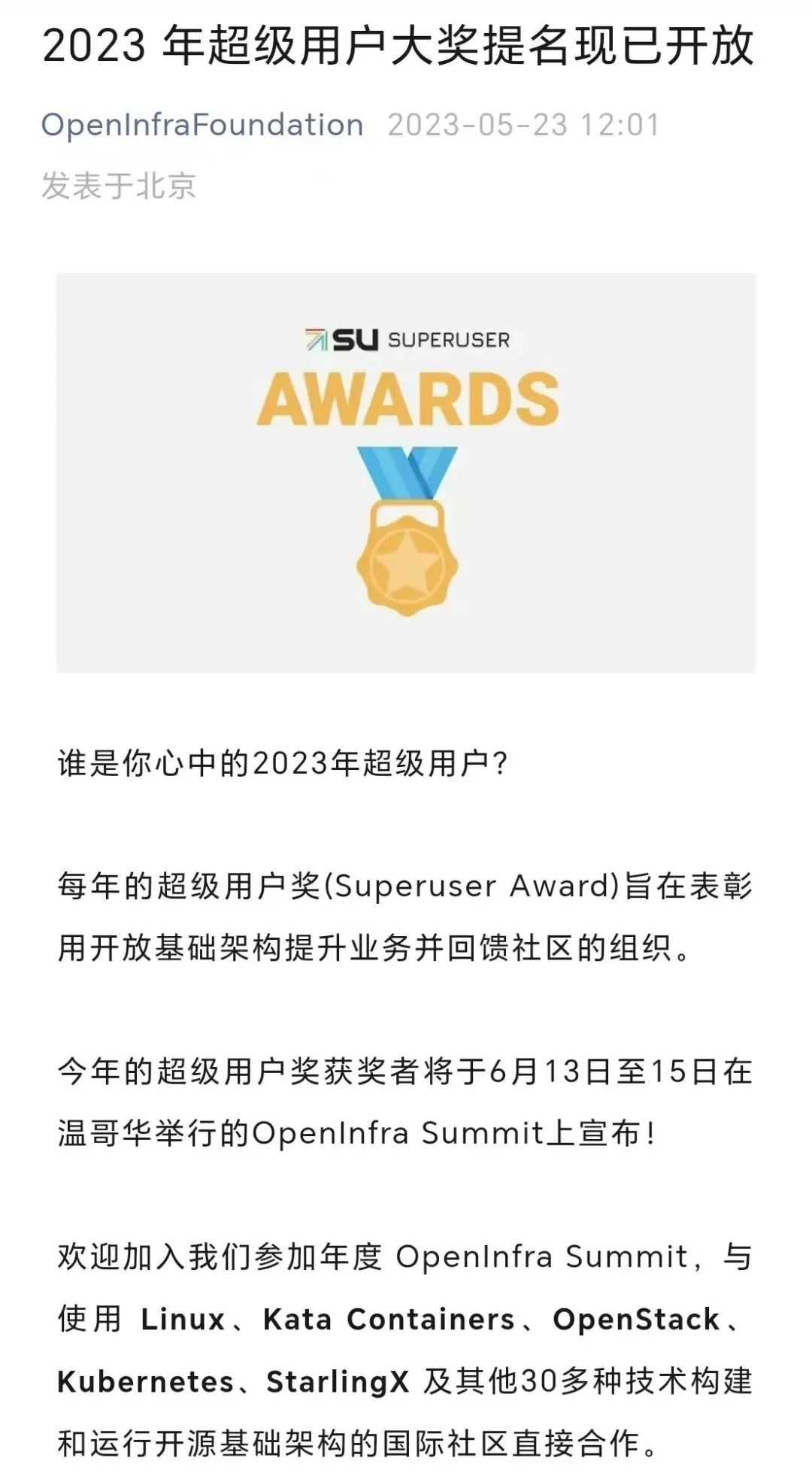 超級(jí)用戶大獎(jiǎng)由OpenInfra基金會(huì)2014年在巴黎峰會(huì)首次頒發(fā),旨在表彰在激烈的競(jìng)爭(zhēng)中采用開源基礎(chǔ)設(shè)施技術(shù)脫穎而出,顯著改進(jìn)業(yè)務(wù)并實(shí)現(xiàn)差異化競(jìng)爭(zhēng)優(yōu)勢(shì),積極回饋開源社區(qū)的團(tuán)隊(duì)組織。在業(yè)界,超級(jí)用戶大獎(jiǎng)是備受全球關(guān)注的重量級(jí)評(píng)選,被稱之為云計(jì)算領(lǐng)域的奧斯卡。歷屆超級(jí)用戶大獎(jiǎng)獲得者包括中國(guó)移動(dòng)、雅虎、百度、SK電信、騰訊TStack團(tuán)隊(duì)等。