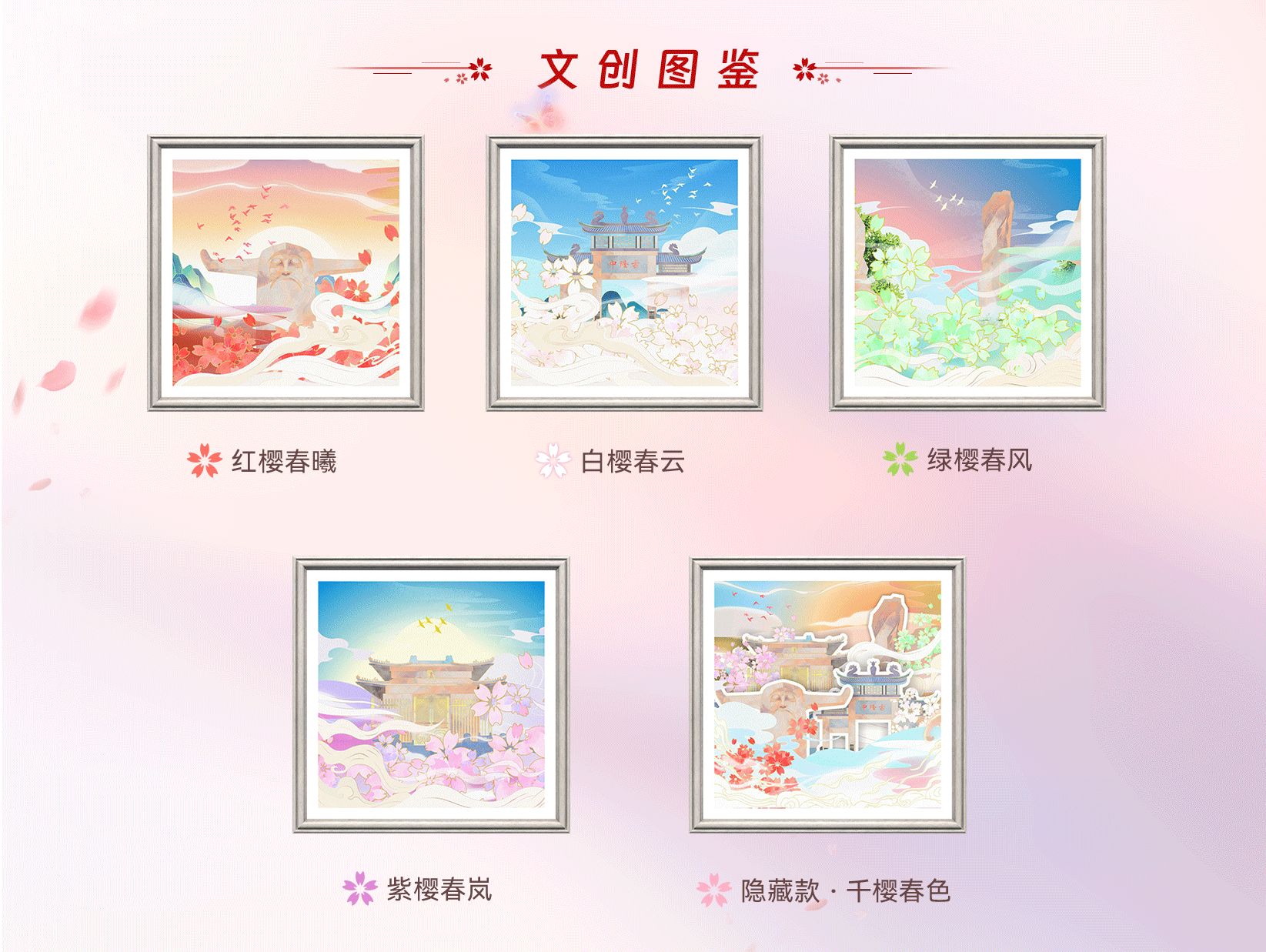 盲盒包含《紅櫻春曦》、《白櫻春云》、《綠櫻春風(fēng)》、《紫櫻春嵐》四款數(shù)字文創(chuàng),總計(jì)400000份。購(gòu)齊此四款者有機(jī)會(huì)領(lǐng)取隱藏款《千櫻春色》(限量6000份),隱藏款特定編號(hào)的用戶可獲得景區(qū)門(mén)票權(quán)益大禮包。