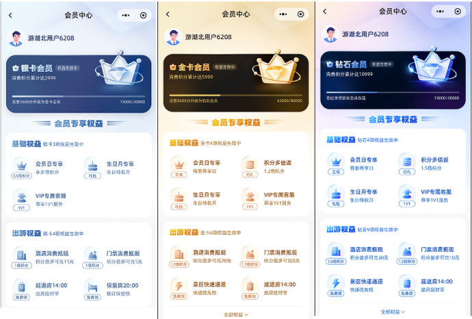 平臺(tái)以消費(fèi)、信用和活躍度為核心要素,會(huì)員通過(guò)消費(fèi)、參與活動(dòng)、打卡等方式獲取成長(zhǎng)值“小旅豆”,完成從銀卡會(huì)員升級(jí)至金卡會(huì)員和鉆石卡會(huì)員的成長(zhǎng),享受不同等級(jí)的專屬折扣、多倍積分、積分當(dāng)錢(qián)花、優(yōu)先預(yù)訂、快速通道、會(huì)員日、生日月、跨境禮包、定制服務(wù)等權(quán)益。