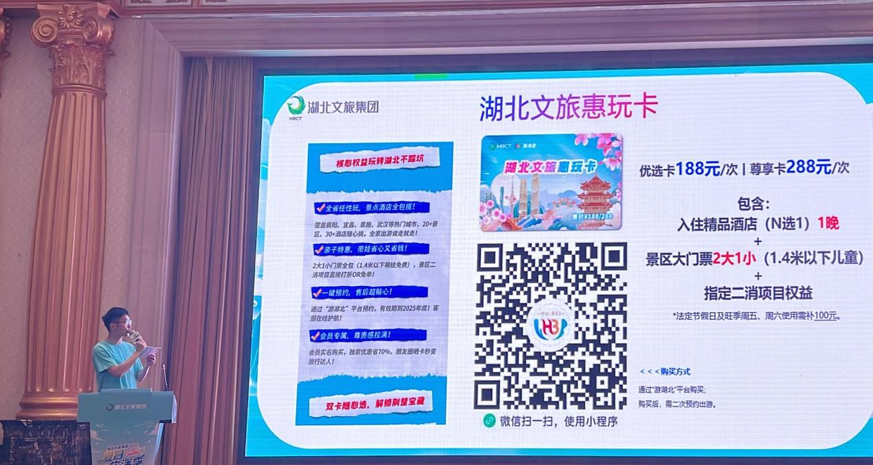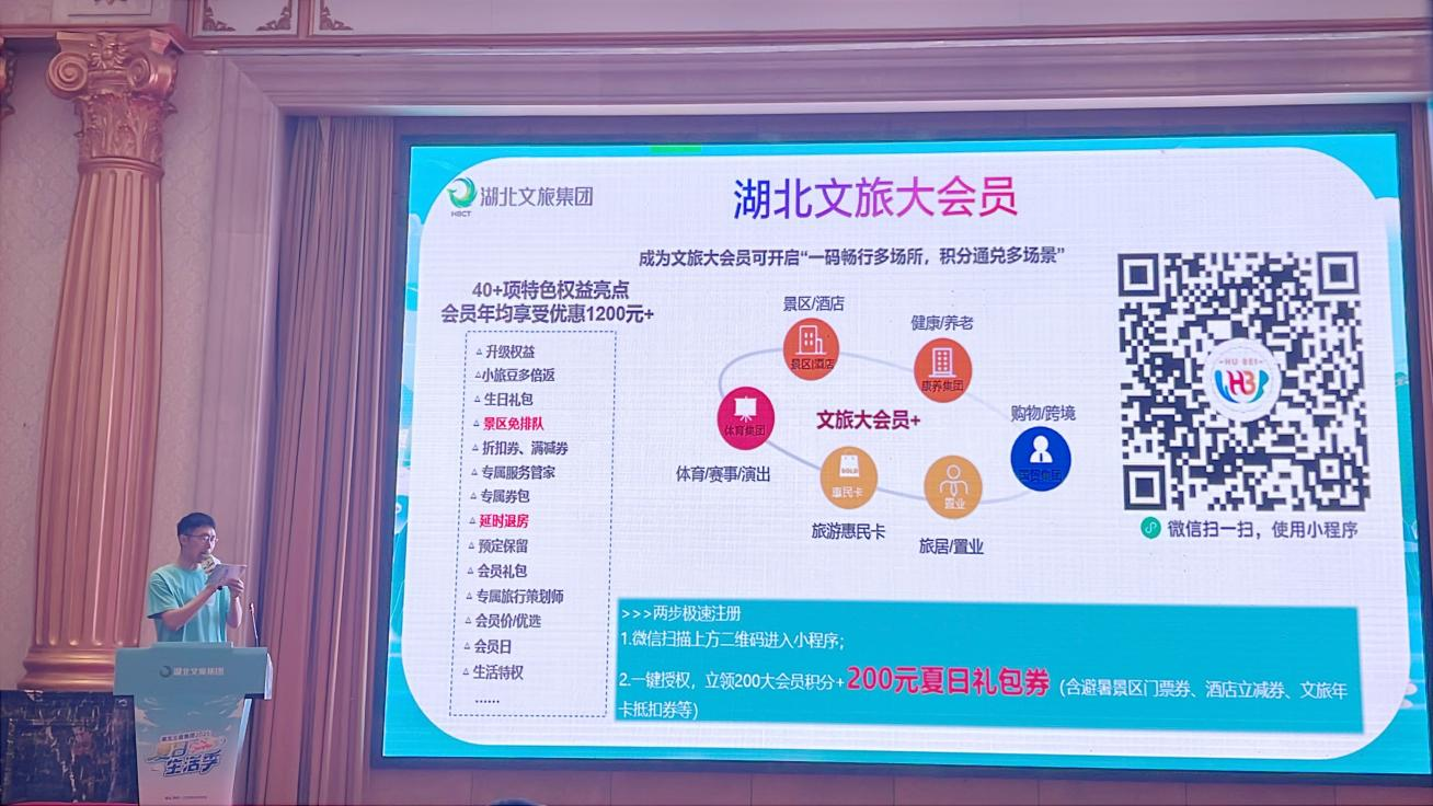啟動(dòng)儀式上,湖北文旅惠玩卡及“湖北文旅大會(huì)員”夏日優(yōu)惠政策成為全場(chǎng)焦點(diǎn)。湖北文旅惠玩卡整合了湖北省內(nèi)豐富的文旅資源,僅需188元/次,即可享受熱門(mén)景區(qū)大門(mén)票(2大1小,兒童限1.4米以下)、所在景區(qū)精品酒店入住一晚,以及指定二次消費(fèi)項(xiàng)目等多重權(quán)益,為游客提供超值的出游選擇。注冊(cè)成為“湖北文旅大會(huì)員”,年均可享價(jià)值1200元以上的優(yōu)惠權(quán)益及景區(qū)免排隊(duì)、延遲退房等40多項(xiàng)專屬權(quán)益?;顒?dòng)現(xiàn)場(chǎng)推出“注冊(cè)立領(lǐng)200積分+200元夏日禮包券”限時(shí)福利,引發(fā)觀眾掃碼注冊(cè)熱潮。