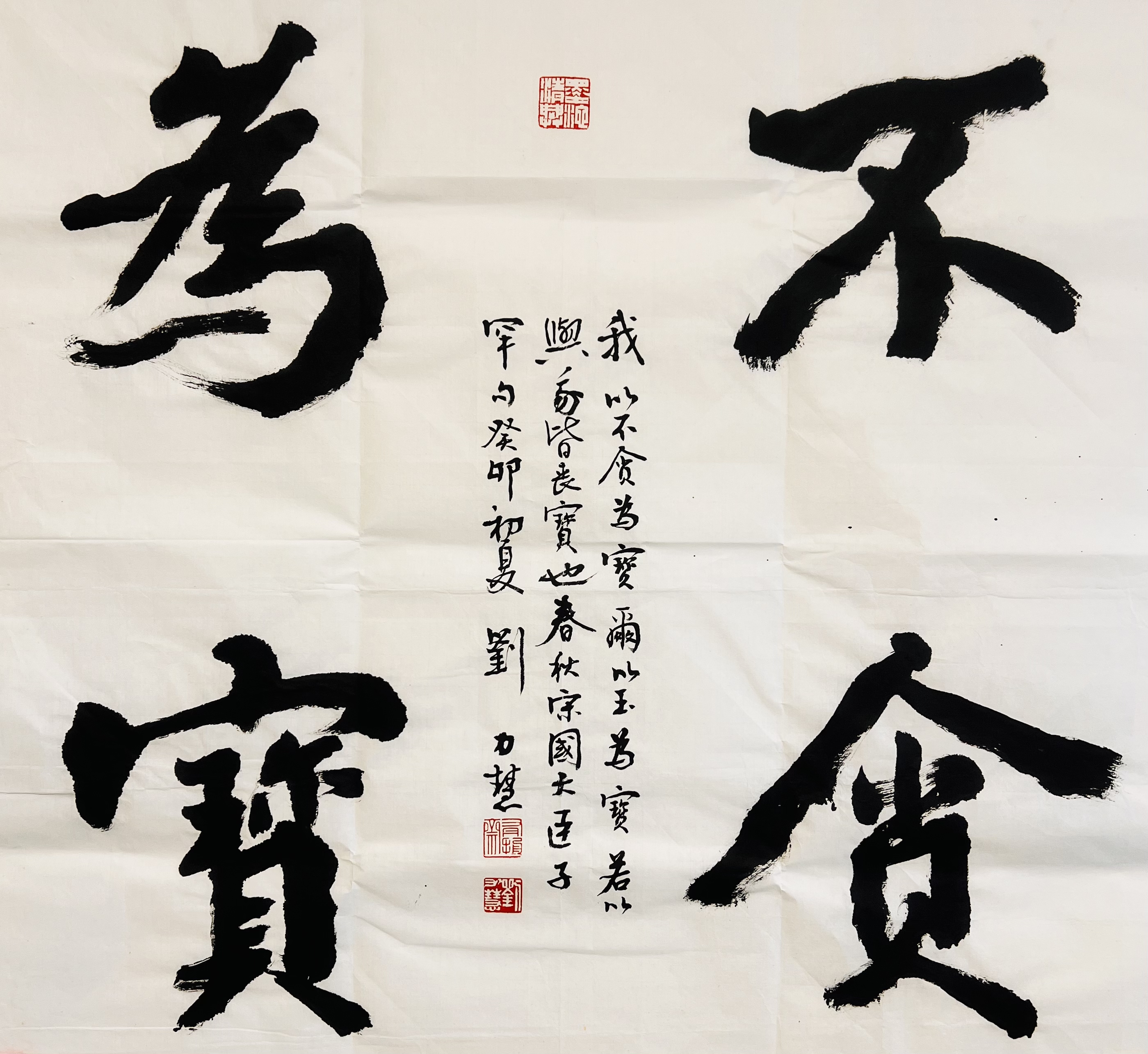 “不貪為寶”作品創(chuàng)意出自于《左傳·襄公十五年》中的廉潔故事,寓意不貪為可貴、崇高,廉潔奉公的高尚品質,作者為劉力慧。