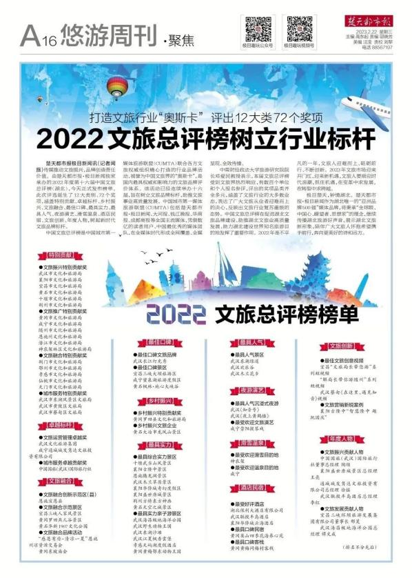 本周熱點(diǎn) 文旅界的“奧斯卡”!古隆中景區(qū)榮獲2022年度中國(guó)文旅總評(píng)榜“最具綜合實(shí)力景區(qū)”等獎(jiǎng)項(xiàng)。2月22日,第十六屆中國(guó)文旅總評(píng)榜正式發(fā)布榜單,古隆中景區(qū)榮獲中國(guó)文旅總評(píng)榜“2022年度最具綜合實(shí)力景區(qū)”、“2022年度文旅營(yíng)銷(xiāo)新銳案例”。中國(guó)文旅總評(píng)榜是在中國(guó)文旅品牌(博鰲)論壇背景下,由中國(guó)城市第一媒體文旅聯(lián)盟(CUMTA)聯(lián)合各方文旅權(quán)威組織精心打造的行業(yè)品牌活動(dòng),被譽(yù)為中國(guó)文旅界的“奧斯卡”獎(jiǎng),是國(guó)內(nèi)最具權(quán)威和影響力的文旅品牌評(píng)價(jià)體系?;顒?dòng)自2022年11月啟動(dòng)以來(lái),共收到數(shù)百個(gè)單位和個(gè)人的報(bào)名資料,經(jīng)評(píng)審委員會(huì)專(zhuān)家審定,最終誕生了12大類(lèi)別、72個(gè)獎(jiǎng)項(xiàng),涵蓋文旅局、景區(qū)、旅游目的地、旅行社、酒店民宿、鄉(xiāng)村振興、演藝夜游、文旅推廣、年度人物等。襄陽(yáng)古隆中景區(qū)開(kāi)創(chuàng)了新的文旅融合發(fā)展格局,利用新媒體矩陣,持續(xù)舉辦了多場(chǎng)新媒體活動(dòng),在全國(guó)范圍展示了深厚的三國(guó)文化底蘊(yùn),展示了湖北文旅新形象。 清江畫(huà)廊公司榮獲2022年度中國(guó)景區(qū)影響力品牌“年度創(chuàng)新山水型景區(qū)”稱(chēng)號(hào)。 近日,2022年中國(guó)文旅產(chǎn)業(yè)投資運(yùn)營(yíng)大會(huì)在湖北武漢召開(kāi),大會(huì)上公布了2022年度中國(guó)景區(qū)影響力品牌榜單,清江畫(huà)廊景區(qū)榮獲“年度創(chuàng)新山水型景區(qū)”稱(chēng)號(hào)。2022年度中國(guó)景區(qū)影響力品牌排名是通過(guò)監(jiān)測(cè)景區(qū)在互聯(lián)網(wǎng)和移動(dòng)互聯(lián)網(wǎng)的搜索、運(yùn)營(yíng)、媒體、點(diǎn)評(píng)指數(shù),綜合分析計(jì)算得出MBI/MCI指數(shù)排名,來(lái)反映一段時(shí)間內(nèi)景區(qū)在全國(guó)的品牌影響力,通過(guò)海量真實(shí)數(shù)據(jù)制作榜單。清江畫(huà)廊景區(qū)的入選,也代表著文旅行業(yè)正在不遺余力的推進(jìn)文化和旅游產(chǎn)業(yè)鏈合作進(jìn)程,推進(jìn)企業(yè)跨越式發(fā)展,努力為市場(chǎng)提交一份滿意的答卷。 海外(中旅)研學(xué)百人團(tuán)首發(fā)啟動(dòng)。以研學(xué)為途徑,博學(xué)而篤志;以自然為媒,躬行求知。2月15日,海外(中旅)集團(tuán)研學(xué)中心帶領(lǐng)330余名學(xué)子們來(lái)到了農(nóng)耕年華研學(xué)基地,一場(chǎng)最美的研學(xué)際遇在等待著他們。2023新春首次啟動(dòng)勞動(dòng)教育研學(xué)之旅,共計(jì)330余名小學(xué)學(xué)子們,在海外(中旅)集團(tuán)研學(xué)中心與學(xué)校的共同組織下,將一年級(jí)至六年級(jí)的學(xué)子們劃分為兩個(gè)團(tuán)隊(duì),一至三年級(jí)以國(guó)學(xué)與農(nóng)事為主,將中華國(guó)學(xué)與農(nóng)事生產(chǎn)文化代代相傳,既豐富了勞動(dòng)體驗(yàn),又積累了國(guó)學(xué)底蘊(yùn)。四至六年級(jí)以手工與農(nóng)耕為主,從小養(yǎng)成熱愛(ài)勞動(dòng),勤于實(shí)踐,珍惜糧食,懂得感恩的優(yōu)秀品德并受益終生。 最新資訊 ● 甘肅寧夏攜手打造“大西北”文旅IP。寧夏回族自治區(qū)文化和旅游廳與甘肅省文化和旅游廳在甘肅蘭州進(jìn)行座談交流,共商大西北文旅抱團(tuán)發(fā)展、做大做強(qiáng)大西北文旅品牌,合力促進(jìn)文旅消費(fèi)復(fù)蘇等事宜。根據(jù)會(huì)議消息,甘肅省文旅廳將全力支持寧夏文旅廳提出的關(guān)于“共商籌備第二屆大西北文旅高峰會(huì)、市場(chǎng)化發(fā)行西北旅游一卡通、成立西北生態(tài)康養(yǎng)旅游聯(lián)盟、做大做強(qiáng)大西北文旅品牌”等合作事宜和相關(guān)業(yè)務(wù)工作;寧夏文旅系統(tǒng)將著力加強(qiáng)戰(zhàn)略協(xié)作,精誠(chéng)推進(jìn)全面融合,共同打造好“大西北”這個(gè)獨(dú)特而共有的超級(jí)文旅大IP,深度推進(jìn)與兄弟省區(qū)的合作,共同提振旅游經(jīng)濟(jì),大力促進(jìn)文旅復(fù)蘇發(fā)展,合力推動(dòng)雙方文旅系統(tǒng)在更大范圍、更寬領(lǐng)域、更深層次開(kāi)創(chuàng)務(wù)實(shí)合作新局面。 ● 成都高質(zhì)量打造文旅經(jīng)濟(jì)發(fā)展核心區(qū)推動(dòng)世界文化名城建設(shè)。2月22日,成都市文化廣電旅游局發(fā)布《高質(zhì)量打造全省文旅經(jīng)濟(jì)發(fā)展核心區(qū)推動(dòng)世界文化名城建設(shè)行動(dòng)方案》。到2025年,力爭(zhēng)實(shí)現(xiàn)成都市文創(chuàng)產(chǎn)業(yè)增加值3100億—3400億元,占GDP比重達(dá)到12%以上,旅游接待游客達(dá)到3.5億人次,總收入達(dá)到6300億元,文化產(chǎn)業(yè)增加值占全省比重達(dá)到53%,旅游總收入占全省比重增長(zhǎng)到39%。實(shí)施文創(chuàng)、旅游企業(yè)梯度培育計(jì)劃,支持本土龍頭企業(yè)上市及沖刺全國(guó)文化企業(yè)30強(qiáng)、中國(guó)旅游集團(tuán)20強(qiáng),實(shí)現(xiàn)省級(jí)文化和旅游產(chǎn)業(yè)優(yōu)秀龍頭企業(yè)達(dá)到15家以上。 ● 長(zhǎng)沙打造文旅業(yè)“復(fù)原力” 發(fā)放400萬(wàn)元消費(fèi)券。長(zhǎng)沙市文化旅游廣