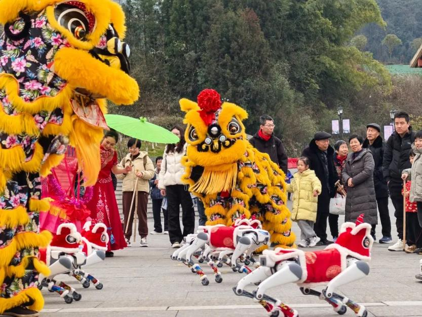 科技過年,機器狗成新春“網(wǎng)紅”。正月初一至元宵節(jié),數(shù)旅集團聯(lián)合恩施大峽谷推出的“機器狗”春節(jié)舞蹈隊將在景區(qū)開展迎賓、舞蹈一條龍服務。機器狗舞蹈隊展示迎賓舞蹈、參與舞獅互動、太空步融合土家擺手舞,科技感和民俗范在峽谷山水間擦出火花。為游客帶來全新的游覽體驗,增添節(jié)日樂趣,提升景區(qū)的服務質量和吸引力。