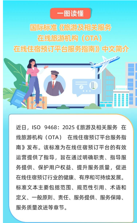 我國牽頭制定全球首個(gè)在線旅游機(jī)構(gòu)相關(guān)國際標(biāo)準(zhǔn),以“中國方案”推動(dòng)全球旅游服務(wù)標(biāo)準(zhǔn)化進(jìn)程。近日,我國牽頭制定的《旅游及相關(guān)服務(wù)在線旅游機(jī)構(gòu)(OTA)在線住宿預(yù)訂平臺服務(wù)指南》(ISO9468:2025)國際標(biāo)準(zhǔn)正式發(fā)布。這是全球首個(gè)在線旅游機(jī)構(gòu)相關(guān)國際標(biāo)準(zhǔn),旨在規(guī)范全球在線住宿預(yù)訂平臺及其服務(wù),破解“大數(shù)據(jù)殺熟”“捆綁消費(fèi)”“退改難”等痛點(diǎn),構(gòu)建公平透明的消費(fèi)生態(tài)。《指南》明確了平臺方和住宿服務(wù)提供商的責(zé)任,規(guī)范了訂購、支付、退改、評價(jià)等環(huán)節(jié)的服務(wù)條款,提出了信息安全、財(cái)務(wù)安全和隱私保護(hù)等方面的服務(wù)保障要求。其發(fā)布是中國參與全球標(biāo)準(zhǔn)化工作的生動(dòng)實(shí)踐,將推動(dòng)全球旅游服務(wù)在標(biāo)準(zhǔn)化軌道上實(shí)現(xiàn)高質(zhì)量發(fā)展。