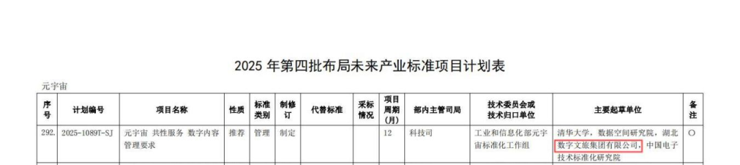 數(shù)旅集團(tuán)標(biāo)準(zhǔn)建設(shè)取得新成果——參編行業(yè)標(biāo)準(zhǔn)入選工信部計(jì)劃。近日,數(shù)旅集團(tuán)參編的《元宇宙共性服務(wù)數(shù)字內(nèi)容管理要求》成功入選工業(yè)和信息化部2025年第四批行業(yè)標(biāo)準(zhǔn)制修訂計(jì)劃——布局未來(lái)產(chǎn)業(yè)標(biāo)準(zhǔn)項(xiàng)目計(jì)劃。此次入選,標(biāo)志著數(shù)旅集團(tuán)在元宇宙標(biāo)準(zhǔn)化建設(shè)方面取得新進(jìn)展,也為推動(dòng)構(gòu)建可信、有序的元宇宙生態(tài)提供重要參考。未來(lái),數(shù)旅集團(tuán)將持續(xù)深化國(guó)有企業(yè)改革,充分發(fā)揮“科改企業(yè)”創(chuàng)新主體作用,通過(guò)“標(biāo)準(zhǔn)引領(lǐng)、創(chuàng)新驅(qū)動(dòng)”的發(fā)展路徑,不斷完善標(biāo)準(zhǔn)化工作體系,為文旅產(chǎn)業(yè)高質(zhì)量發(fā)展提供堅(jiān)實(shí)支撐。
